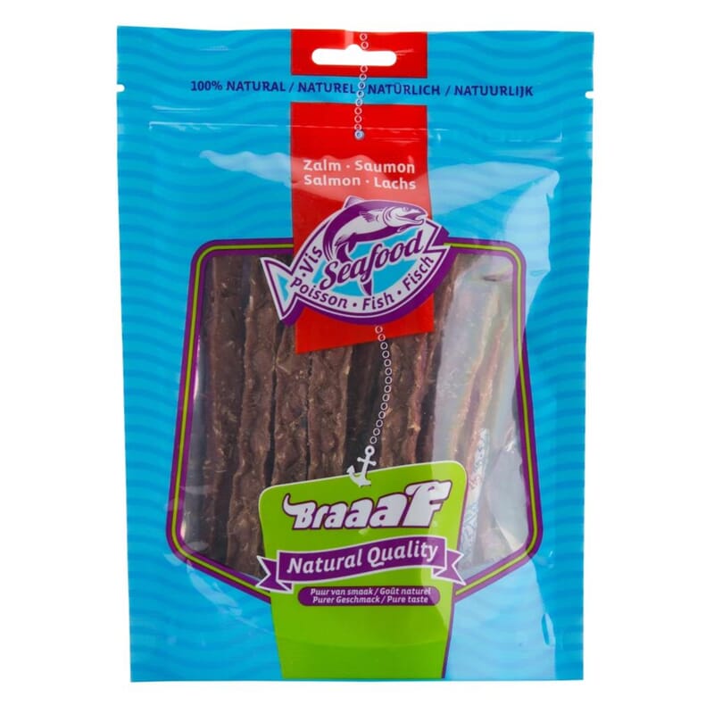 Braaaf fiskesnacks laksestrips er 100 % lufttørket villaks med kun 3,8 % fett. Laksestrimler inneholder essensielle Omega 3-fettsyrer for en sunn hud og pels. Braaafs fiskestrimler inneholder ingen kunstig farge- og smakstilsetning. En fiskesnacks hjelper, i tillegg til tyggeglede, å rense tennene!