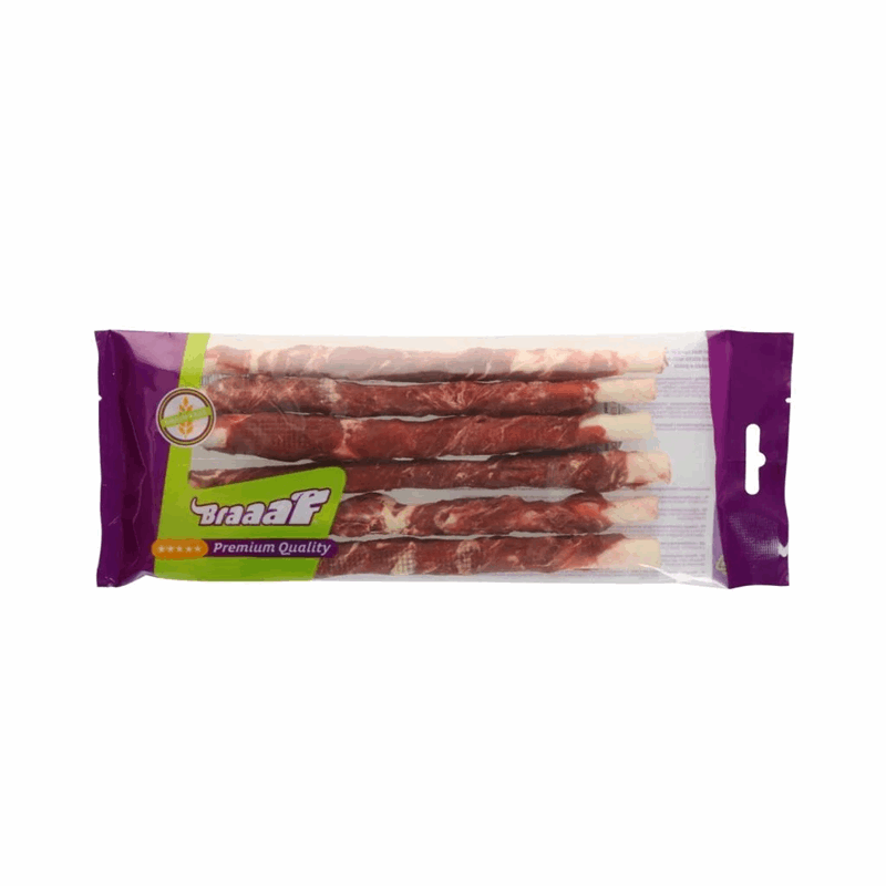 Sammensetning: 53,3 % råskinn, 38,7 % storfekjøtt, 5 % torsk, 2,0 % potetstivelse, sorbitol, glyserin, salt.