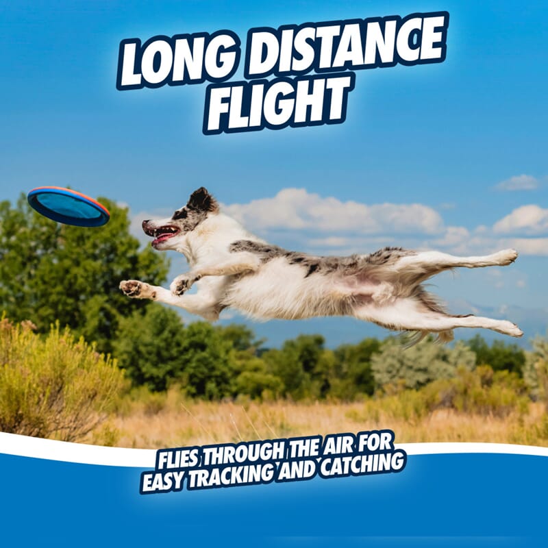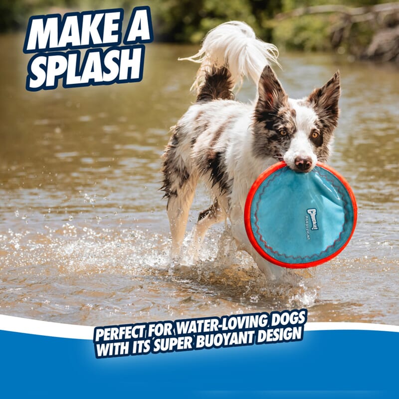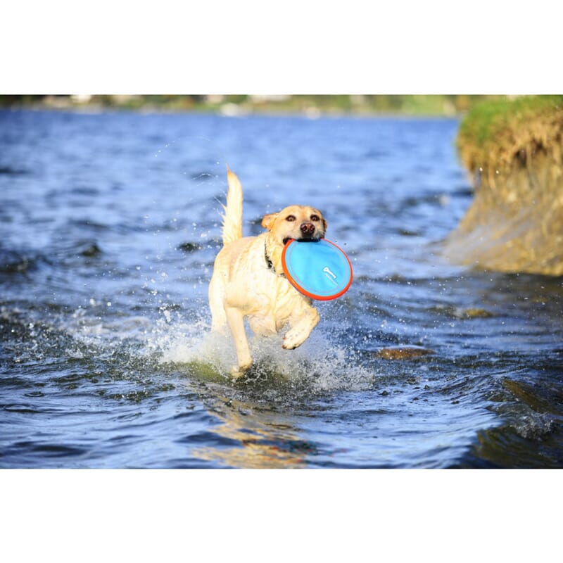 Frisbeen flyter høyt på vann, noe som gjør den godt egnet til lek ved stranden eller innsjøen. De klare blå og oransje fargene gjør den også lett å få øye på – både på land og i vann.